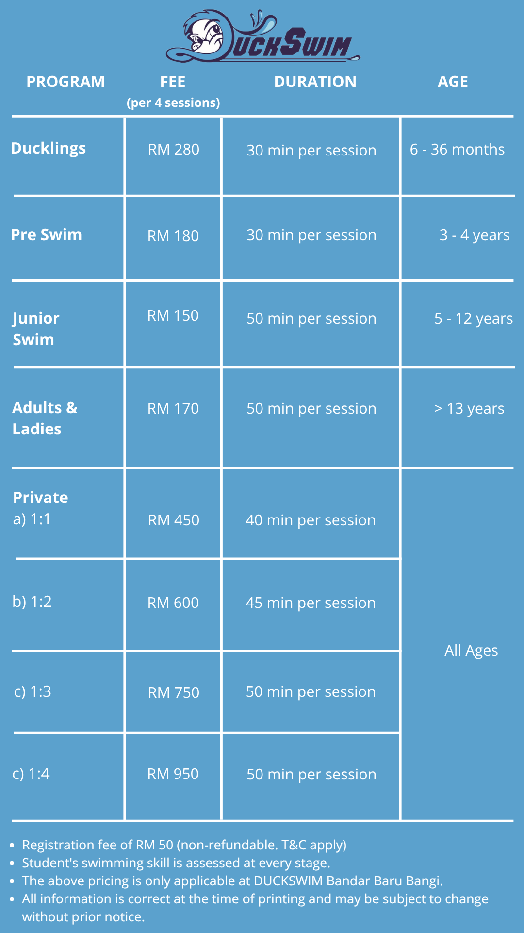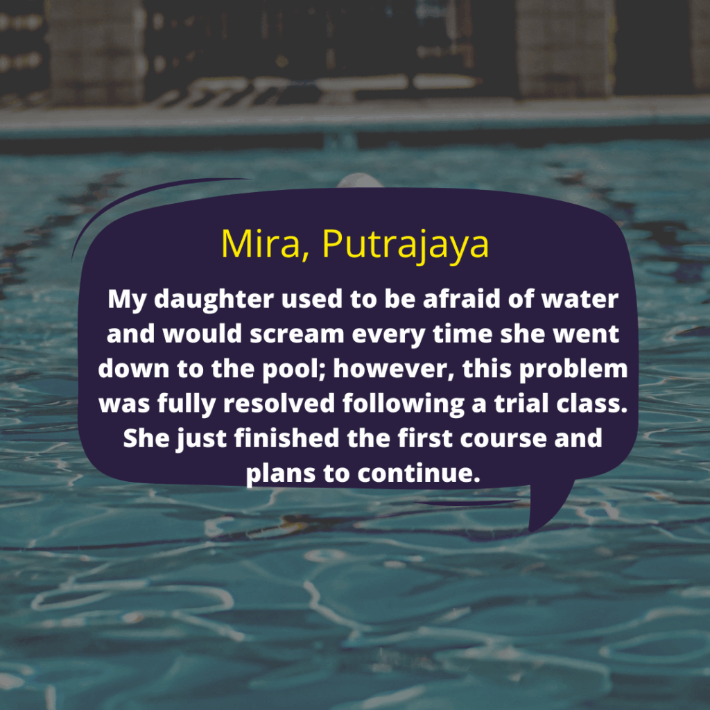 Our swimming training program is highly effective. It uses a powerful reinforcement tool for our students, emphasizing safety, guarantee a personal touch and motivation needs to individual student during swimming lesson. Each student is tracked of their progress through a student card to ensure learning improvement is achieved.